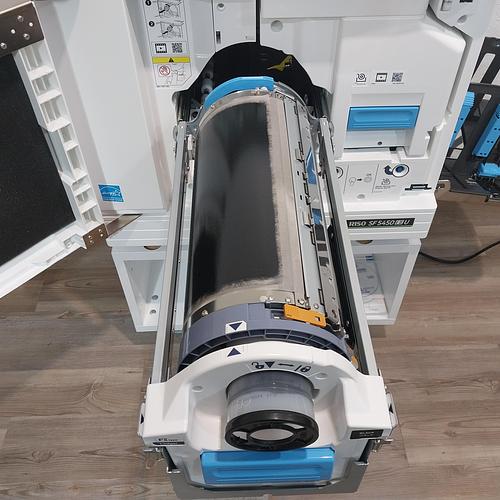 Riso SF5450 digital duplicator equipped with black drum and a stand. It delivers sharp 600 x 300 dpi printing at a fast 150 pages per minute and supports ledger-size paper. This model accommodates various paper types, including recycled, coarse, card stock, and envelopes.
